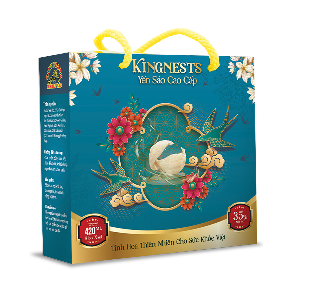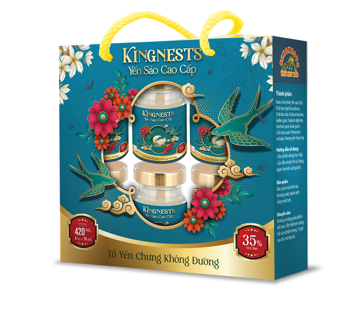 Thành phần sản phẩm: Nước, Yến sào 35%, Chất tạo ngọt (Sucralose), Chất làm dày (Calci Lactat, Gôm Gellan, Natri Alginat, Gôm Xanthan, Gôm Gua), Chất bảo quản (Kali Sorbat), Hương yến tổng hợp.
