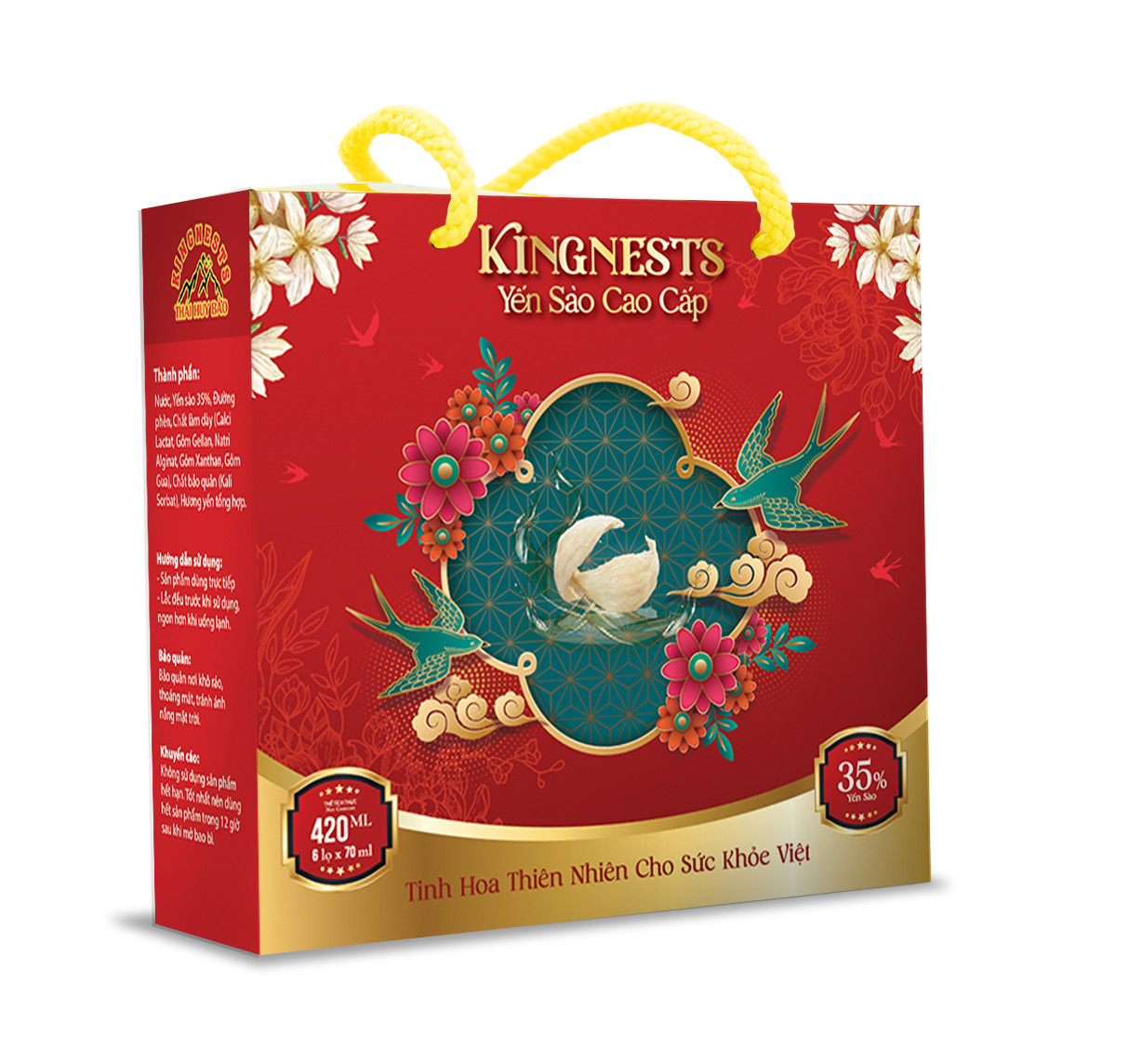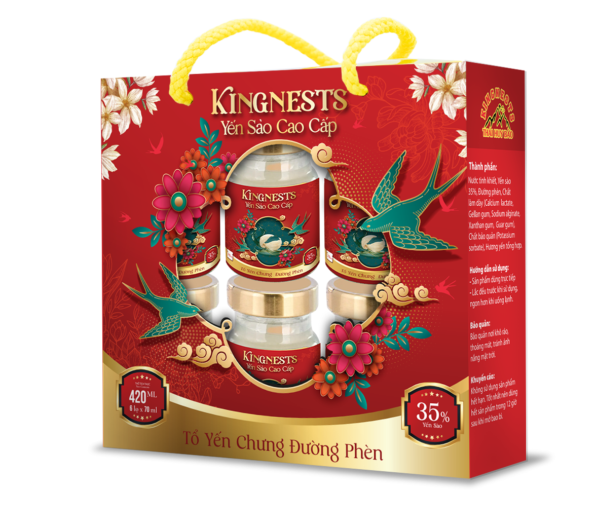 Thành phần sản phẩm: Nước, Yến sào 35%, Đường phèn, Chất làm dày (Calci Lactat, Gôm Gellan, Natri Alginat, Gôm Xanthan, Gôm Gua), Chất bảo quản (Kali Sorbat), Hương yến tổng hợp.