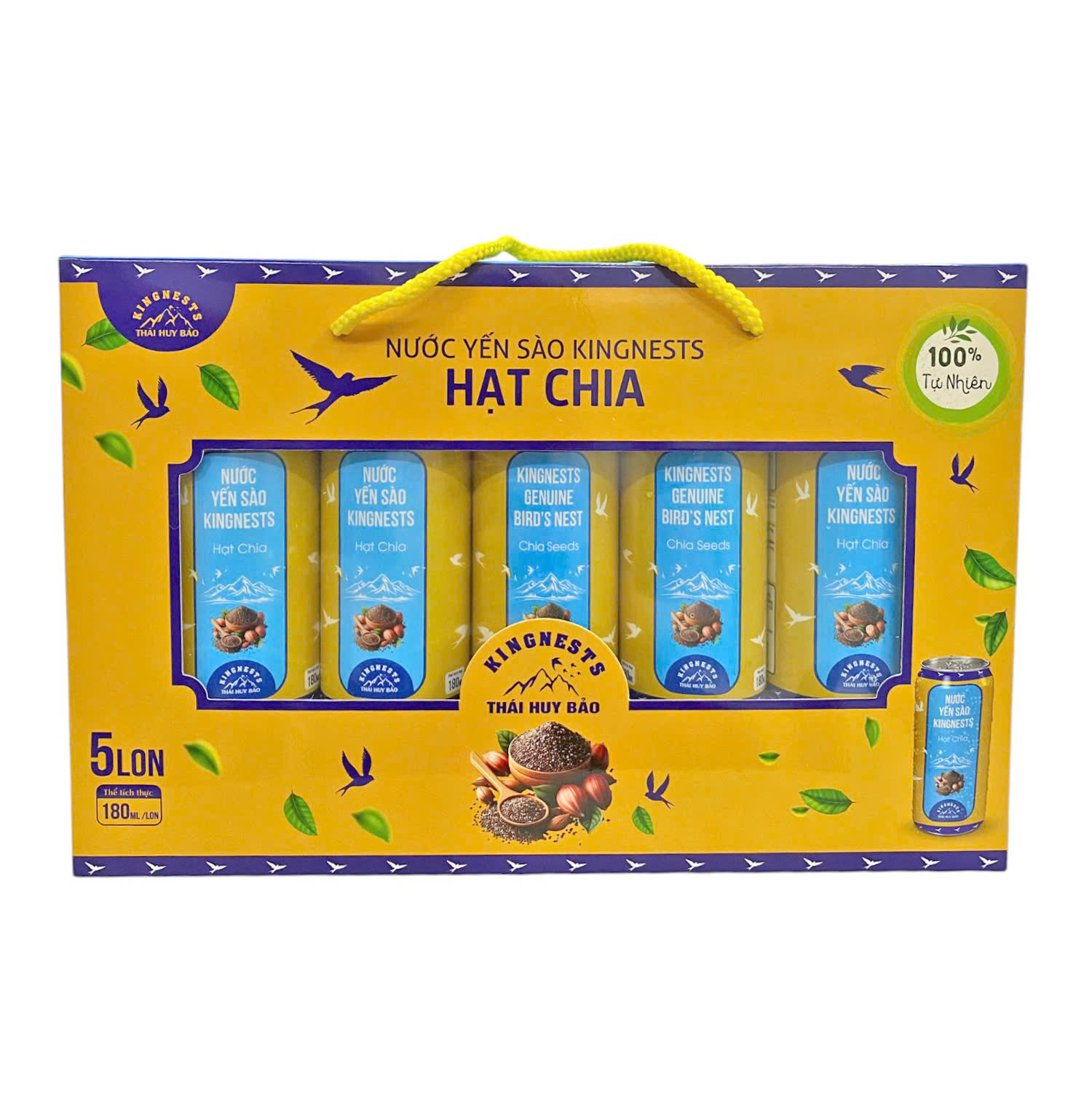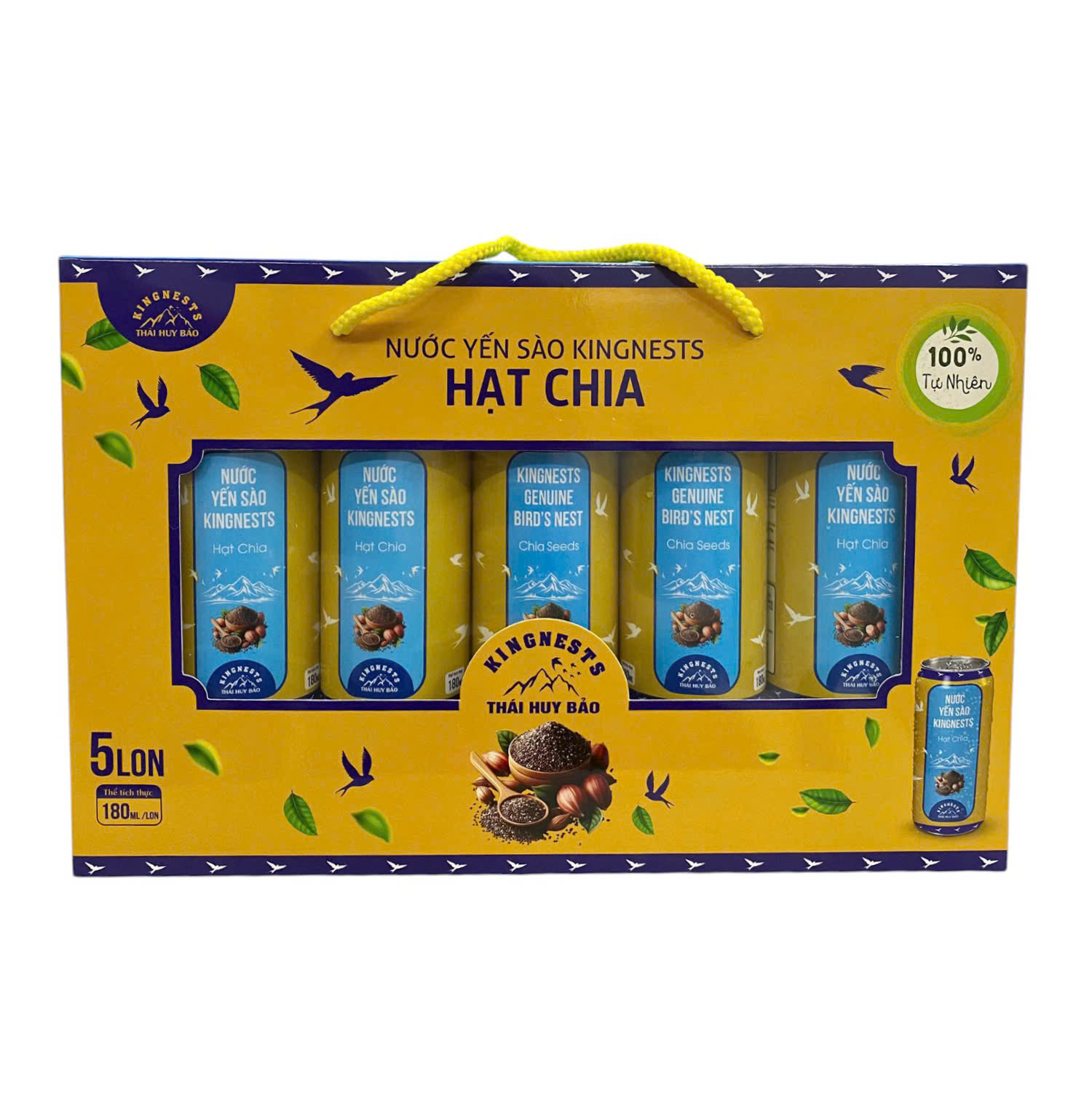 Thành phần sản phẩm: Nước, Yến sào 5.4g/180ml, Đường, Hạt chia 0.1%, Chất làm dày (Calci Lactat, Gôm Gellan, Natri Alginat, Gôm Xanthan, Gôm Gua), Chất bảo quản (Kali Sorbat), Hương yến tổng hợp.